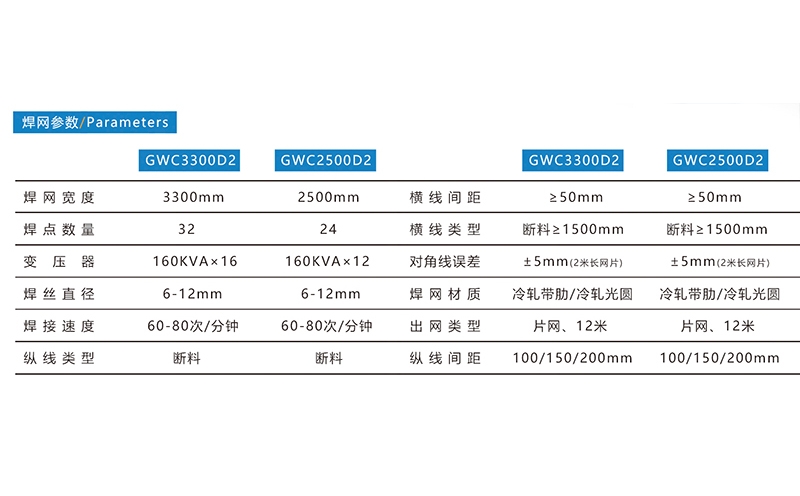 鋼筋網焊接生產線,焊接網寬度3300mm和2500mm兩種,焊接絲徑6-12mm,焊接速度為60-80次/分鐘,縱橫線均為斷料。標準配置:簸箕式輸網與落網、縱線放料架、送徑小車、焊接主機、增料料斗、伺服拉網、冷水機??蛇x配置:快速拉網+升降式落網與出網、自動翻網、空壓機。河北驕陽焊工有限公司,0318-7063097