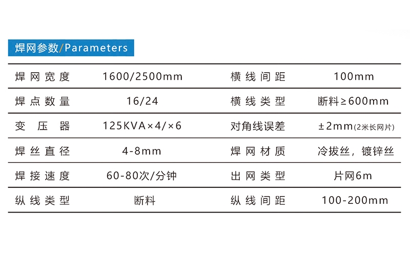 鋼筋網(wǎng)焊接生產(chǎn)線(xiàn),焊接網(wǎng)寬度1600mm/2500mm,焊接絲徑4-8mm,焊接速度為60-80次/分鐘,縱線(xiàn)橫線(xiàn)均為斷料。標(biāo)準(zhǔn)配置:托絲平臺(tái)、焊接主機(jī)、料斗、拉網(wǎng)、小梯子??蛇x配置:料斗平臺(tái)帶梯子、循環(huán)冷卻器、出網(wǎng)托輥。河北驕陽(yáng)焊工有限公司,0318-7063097
