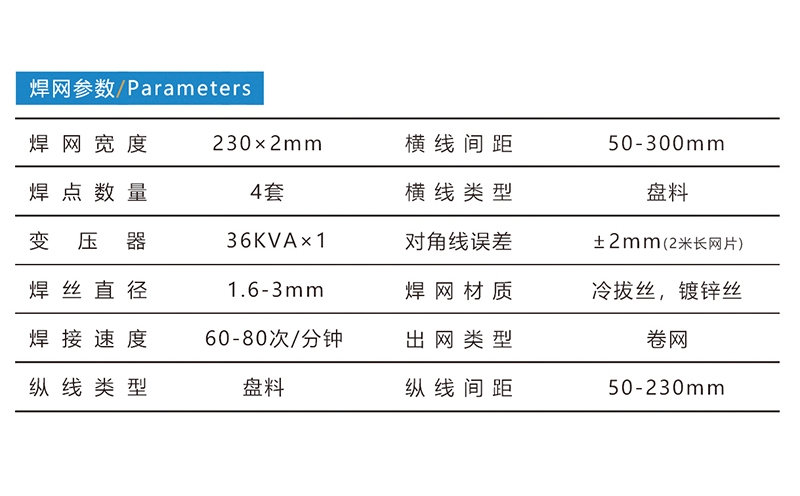 磚帶網(wǎng)焊接生產(chǎn)線,采用盤絲入料,自動校直焊接,焊網(wǎng)寬度230mm×2,焊接絲徑1.6-3mm,焊點數(shù)量4套,焊接速度約60-80次/分鐘,出網(wǎng)形式為卷網(wǎng)。標準配置:放線盤、導線架、緩料裝置、縱線橫線校直系統(tǒng)、橫線切斷裝置、伺服送網(wǎng)??蛇x配置:空壓機。河北驕陽焊工有限公司,0318-7063097