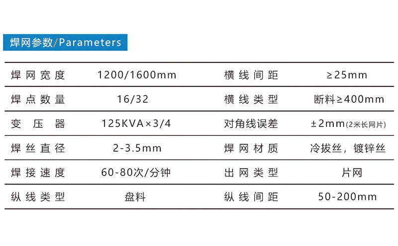 養(yǎng)殖網(wǎng)焊接生產(chǎn)線, 焊接網(wǎng)寬度1200mm/1600mm,焊接絲徑2-3.5mm,焊接速度為60-80次/分鐘,橫線為斷料,縱線為盤(pán)料。標(biāo)準(zhǔn)配置:放線盤(pán)、主機(jī)、料斗、拉網(wǎng)、剪板機(jī)、落網(wǎng)小車(chē)??蛇x配置:橫線切角、單點(diǎn)(或斜絲)補(bǔ)焊機(jī)、分條機(jī)、縱線檢測(cè)裝置、無(wú)毛邊剪網(wǎng)、擺絲裝置、短絲補(bǔ)焊裝置、校直輪+校直輪架。河北驕陽(yáng)焊工有限公司,0318-7063097
