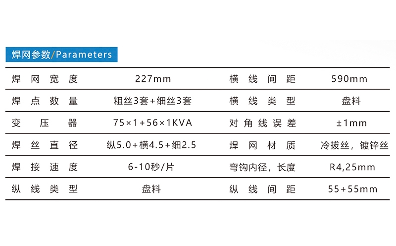 養(yǎng)殖網(wǎng)上提籠門焊接生產(chǎn)線,焊網(wǎng)寬度227mm,焊接絲徑5.0+4.5+2.5mm,焊接速度為6-10秒/片,橫線縱線均為盤料。標(biāo)準(zhǔn)配置:放線盤、主機(jī)、自動(dòng)折彎、自動(dòng)剪網(wǎng)、接網(wǎng)架。河北驕陽(yáng)焊工有限公司,0318-7063097