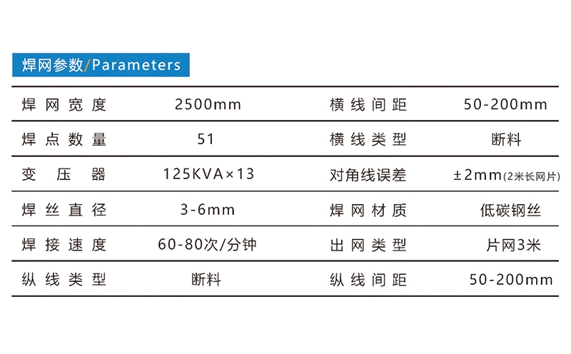 全自動(dòng)圍欄網(wǎng)焊接生產(chǎn)線,焊接網(wǎng)寬度2500mm,焊接絲徑3-6mm,焊接速度為60-80次/分鐘,縱線橫線均為斷料。標(biāo)準(zhǔn)配置:縱線自動(dòng)布料、橫線增料料斗、焊接主機(jī)、伺服拉網(wǎng)、自動(dòng)折彎、自動(dòng)出網(wǎng)、自動(dòng)抓取堆垛、工業(yè)冷水機(jī)??蛇x配置:出網(wǎng)托輥、縱線托絲平臺(tái)、堆垛小車、空壓機(jī)、中頻焊接系統(tǒng)。河北驕陽(yáng)焊工有限公司,0318-7063097