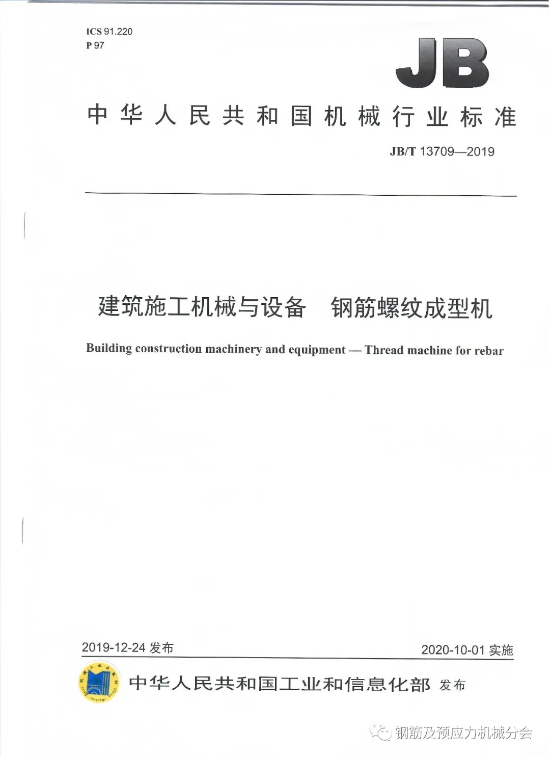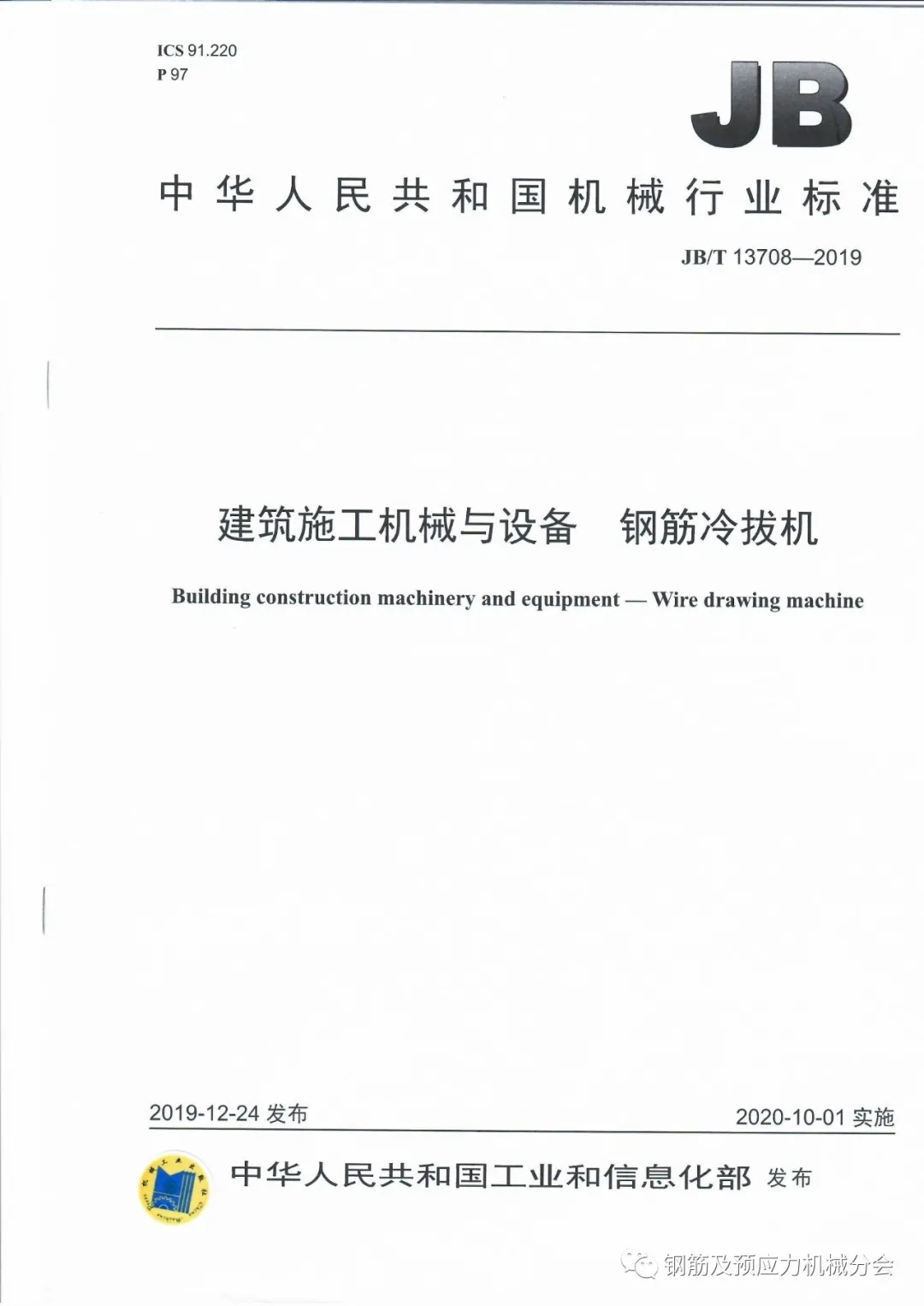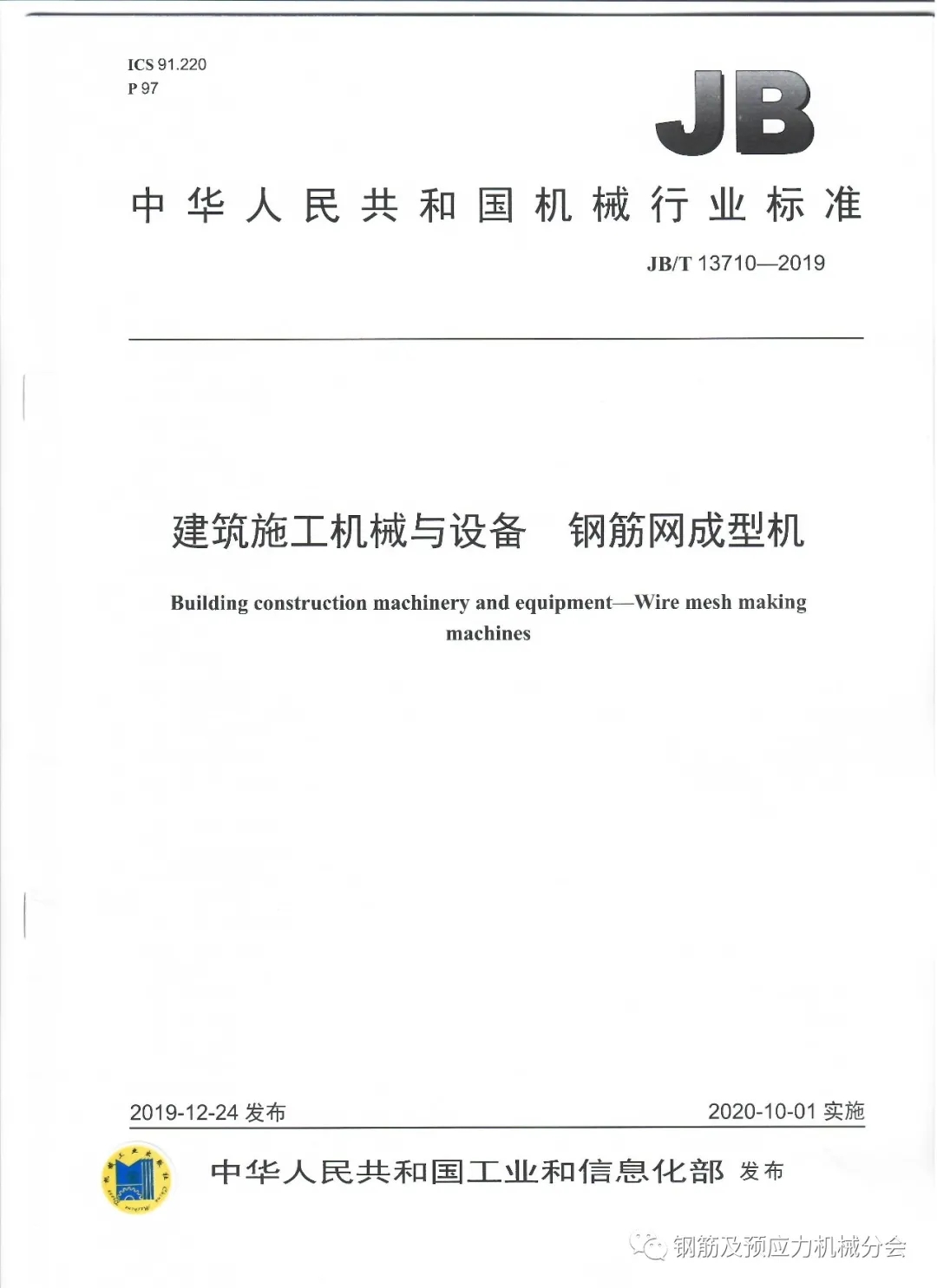 由中國建筑科學(xué)研究院有限公司建筑機(jī)械化研究分院起草、中國工程機(jī)械工業(yè)協(xié)會鋼筋及預(yù)應(yīng)力機(jī)械分會等10余家單位參與編寫的《建筑施工機(jī)械與設(shè)備 鋼筋冷拔機(jī)》JG/T13708-2019標(biāo)準(zhǔn)、《建筑施工機(jī)械與設(shè)備 鋼筋螺紋成型機(jī)》JG/T13709-2019標(biāo)準(zhǔn)和《建筑施工機(jī)械與設(shè)備鋼筋網(wǎng)成型機(jī)》JG/T13710-2019標(biāo)準(zhǔn)自2020年10月01日起實(shí)施。