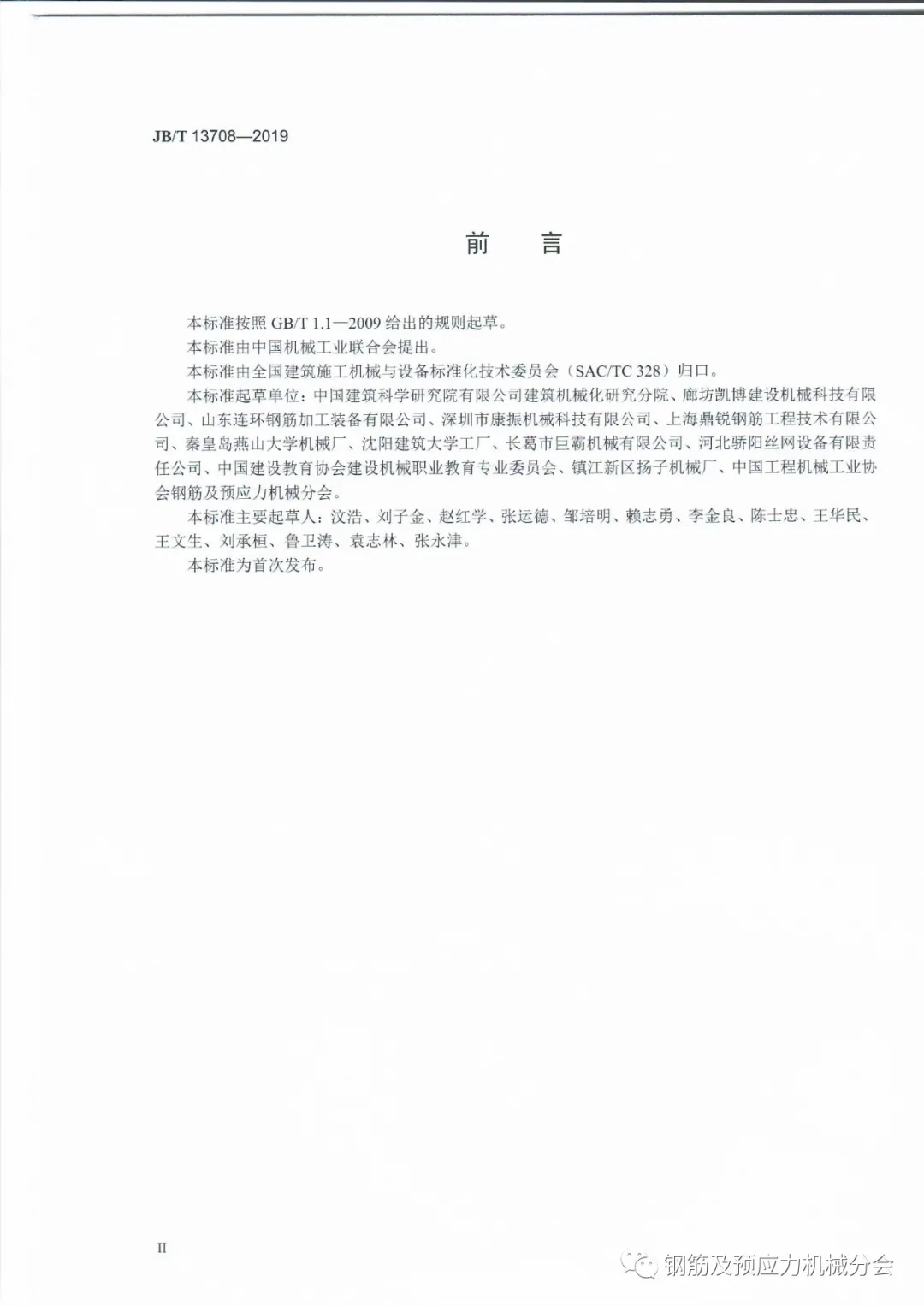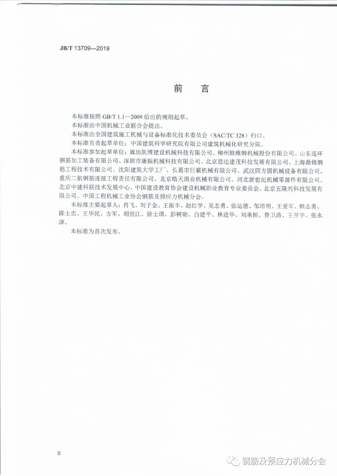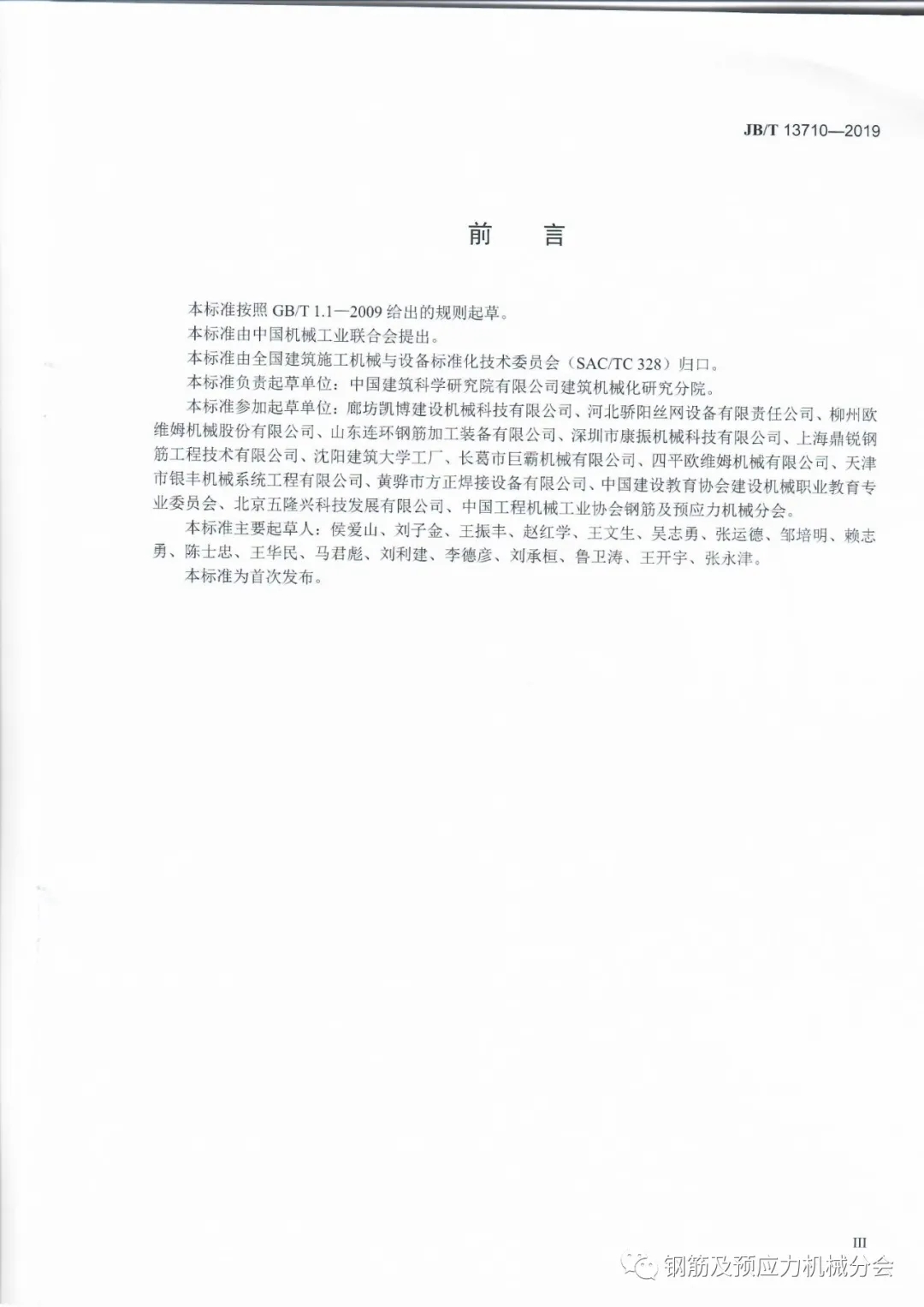 由中國建筑科學(xué)研究院有限公司建筑機(jī)械化研究分院起草、中國工程機(jī)械工業(yè)協(xié)會鋼筋及預(yù)應(yīng)力機(jī)械分會等10余家單位參與編寫的《建筑施工機(jī)械與設(shè)備 鋼筋冷拔機(jī)》JG/T13708-2019標(biāo)準(zhǔn)、《建筑施工機(jī)械與設(shè)備 鋼筋螺紋成型機(jī)》JG/T13709-2019標(biāo)準(zhǔn)和《建筑施工機(jī)械與設(shè)備鋼筋網(wǎng)成型機(jī)》JG/T13710-2019標(biāo)準(zhǔn)自2020年10月01日起實(shí)施。