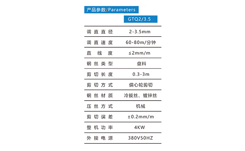 調(diào)直切斷機(jī)GTQ2/3.5,調(diào)直直徑2-3.5mm,調(diào)直速度60-80米/分鐘,偏心輪剪切,剪切長度0.3-3米。可選配置:普通放線盤、制動放線盤、動力放線盤、上提式放線盤+導(dǎo)線架。河北驕陽焊工有限公司,0318-7063097